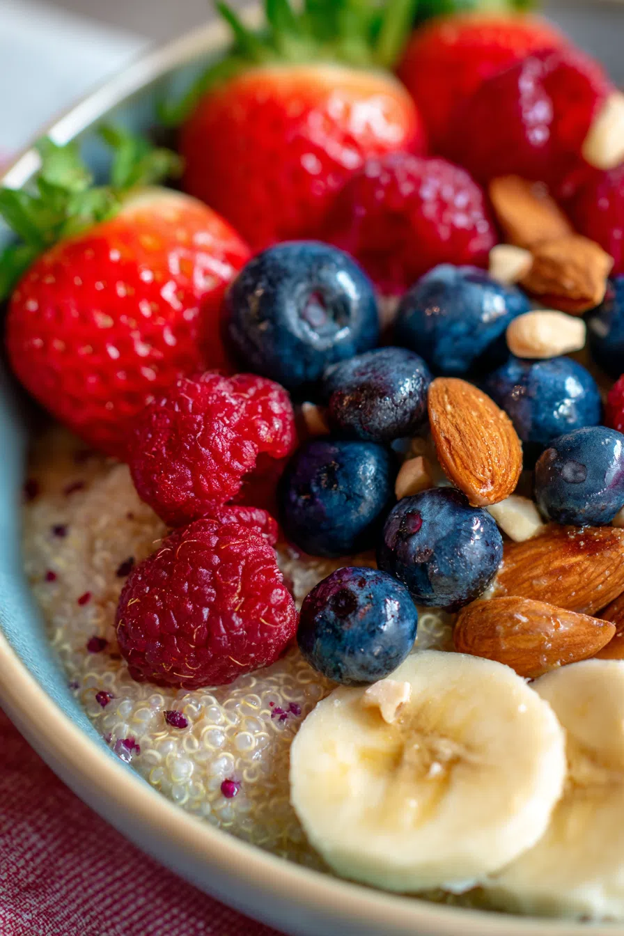 Store leftover quinoa breakfast in the fridge for up to 3 days in an airtight container. Reheat in the microwave or on the stovetop with a splash of milk or water. Freeze for up to 2 months and reheat as needed.