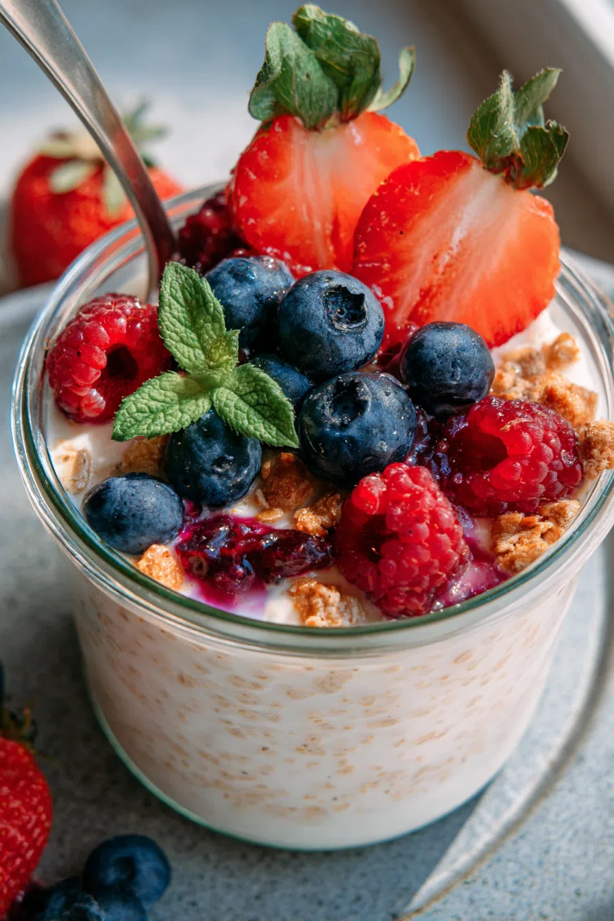 The star ingredients, rolled oats and Greek yogurt, provide a boost of fiber and protein to keep you full until lunchtime. The mixed berries add natural sweetness and a burst of antioxidants!