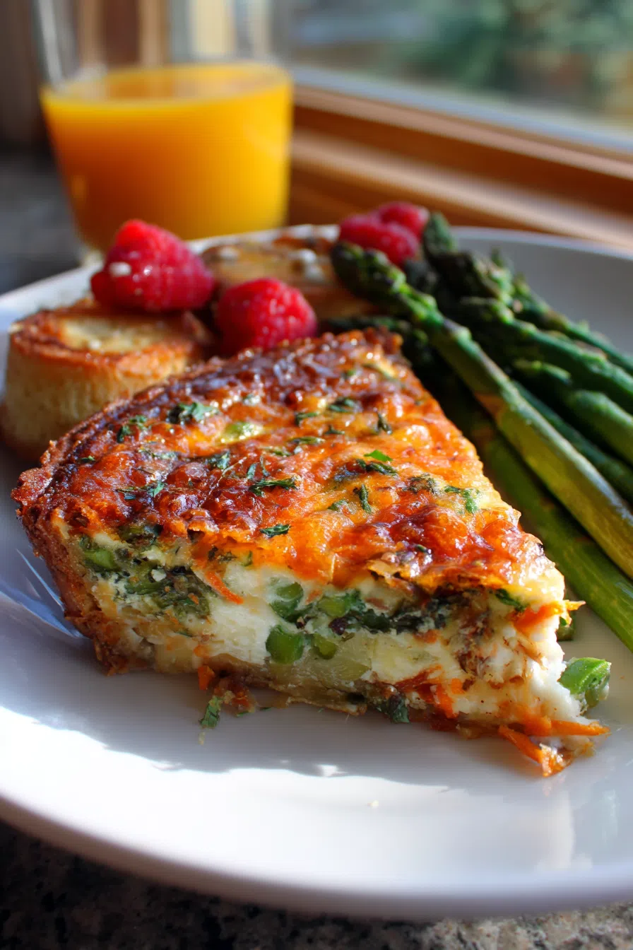 Imagine a warm, golden-brown quiche filled with vibrant spring vegetables, perfect for a cozy morning.